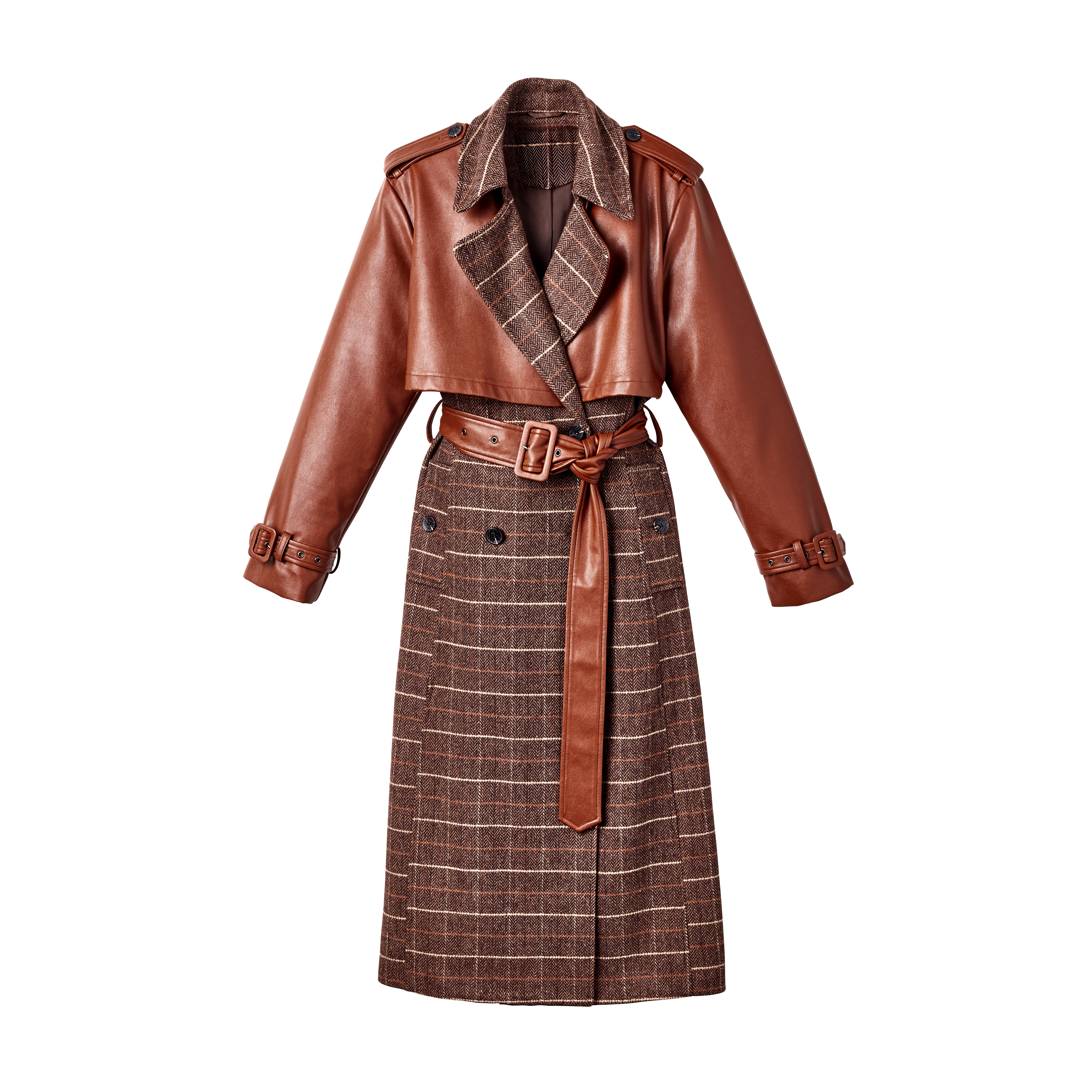 Plaid Faux Leather Belted Trench Coat